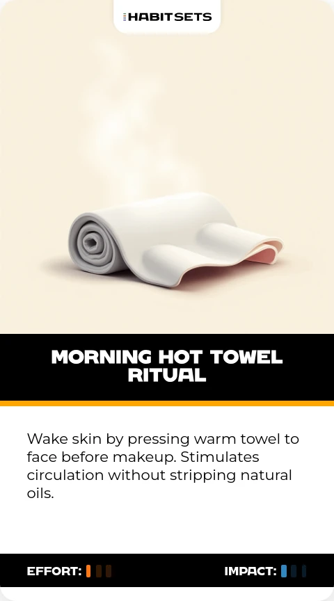 Wake skin by pressing warm towel to face before makeup. Stimulates circulation without stripping natural oils.