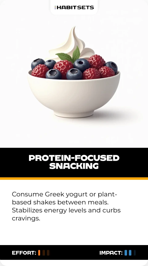 Consume Greek yogurt or plant-based shakes between meals. Stabilizes energy levels and curbs cravings.