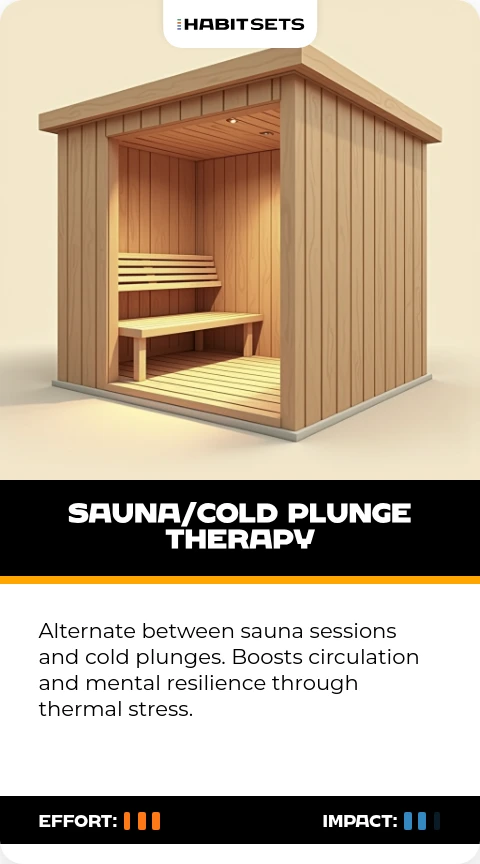 Alternate between sauna sessions and cold plunges. Boosts circulation and mental resilience through thermal stress.