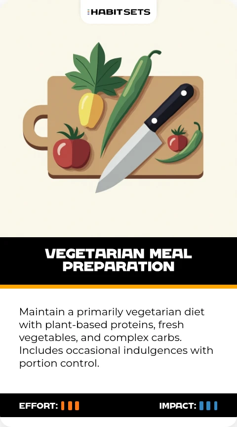 Maintain a primarily vegetarian diet with plant-based proteins, fresh vegetables, and complex carbs. Includes occasional indulgences with portion control.
