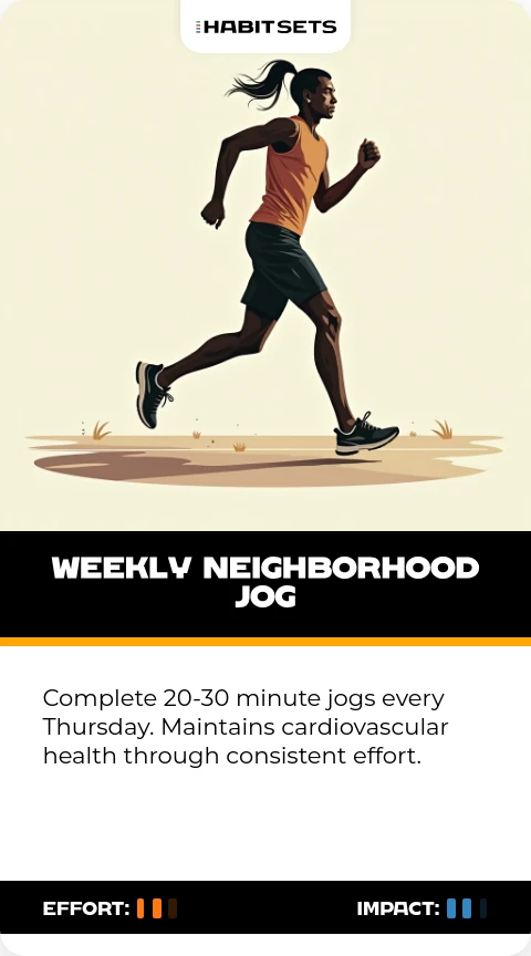 Complete 20-30 minute jogs every Thursday. Maintains cardiovascular health through consistent effort.