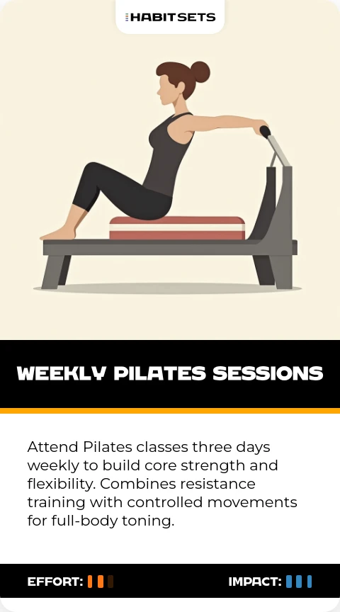 Attend Pilates classes three days weekly to build core strength and flexibility. Combines resistance training with controlled movements for full-body toning.