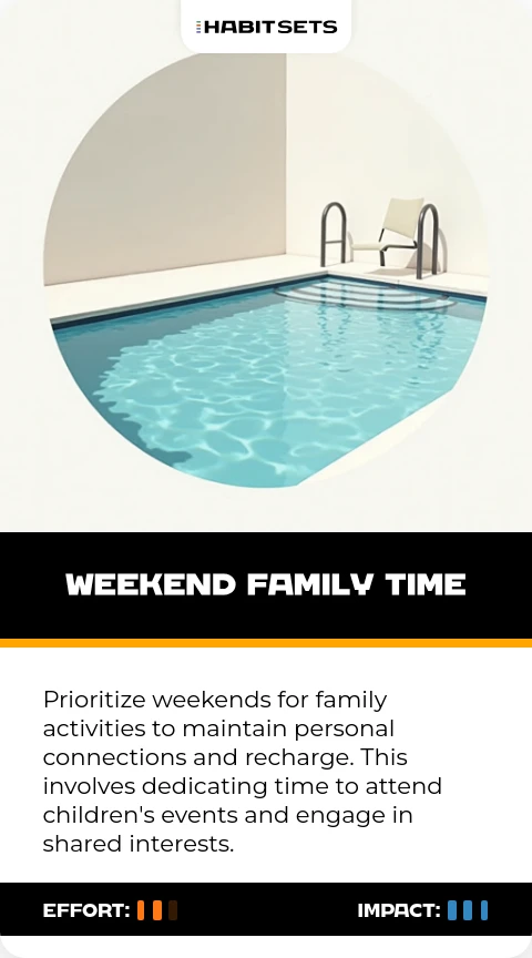 Prioritize weekends for family activities to maintain personal connections and recharge. This involves dedicating time to attend children's events and engage in shared interests.