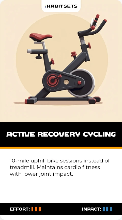 10-mile uphill bike sessions instead of treadmill. Maintains cardio fitness with lower joint impact.