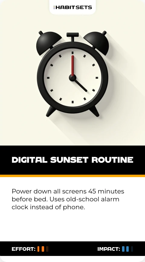 Power down all screens 45 minutes before bed. Uses old-school alarm clock instead of phone.