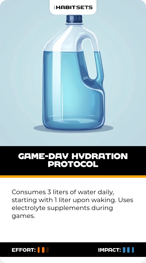Consumes 3 liters of water daily, starting with 1 liter upon waking. Uses electrolyte supplements during games.