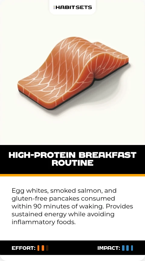Egg whites, smoked salmon, and gluten-free pancakes consumed within 90 minutes of waking. Provides sustained energy while avoiding inflammatory foods.