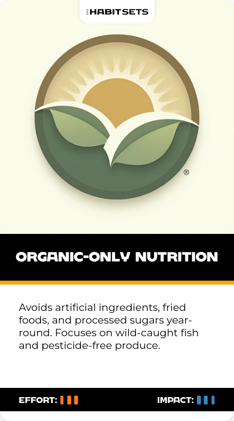 Avoids artificial ingredients, fried foods, and processed sugars year-round. Focuses on wild-caught fish and pesticide-free produce.