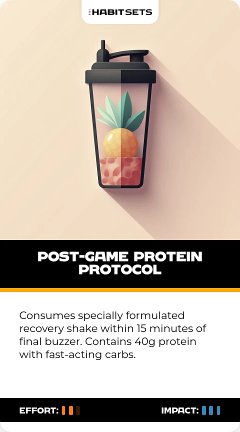 Consumes specially formulated recovery shake within 15 minutes of final buzzer. Contains 40g protein with fast-acting carbs.