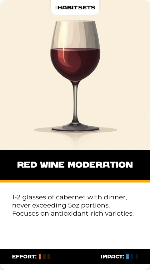 1-2 glasses of cabernet with dinner, never exceeding 5oz portions. Focuses on antioxidant-rich varieties.