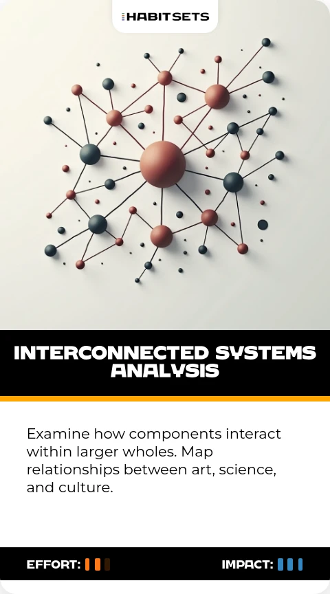 Examine how components interact within larger wholes. Map relationships between art, science, and culture.