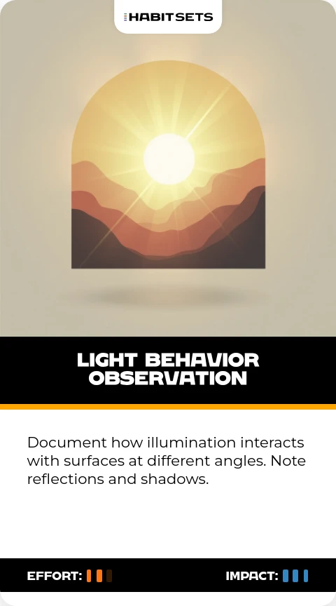 Document how illumination interacts with surfaces at different angles. Note reflections and shadows.