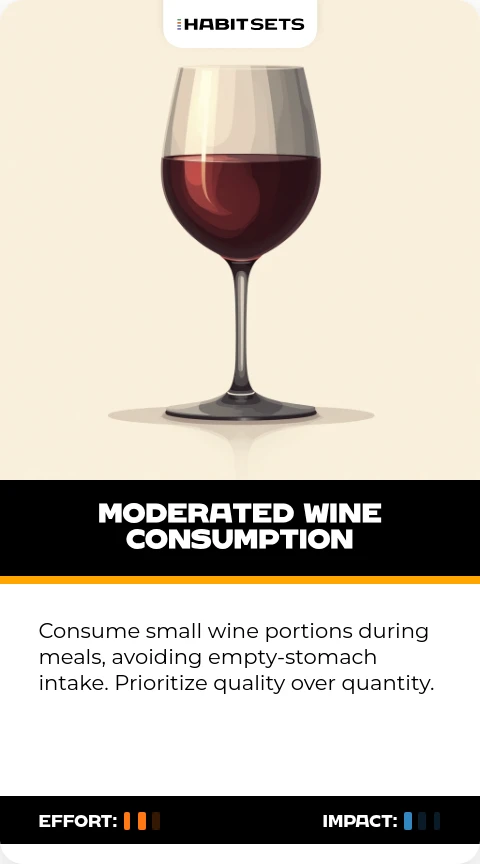 Consume small wine portions during meals, avoiding empty-stomach intake. Prioritize quality over quantity.