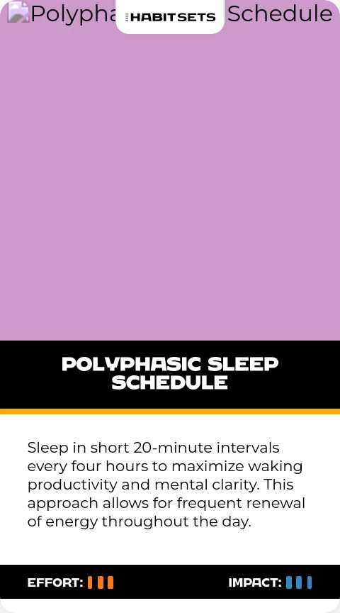 Sleep in short 20-minute intervals every four hours to maximize waking productivity and mental clarity. This approach allows for frequent renewal of energy throughout the day.