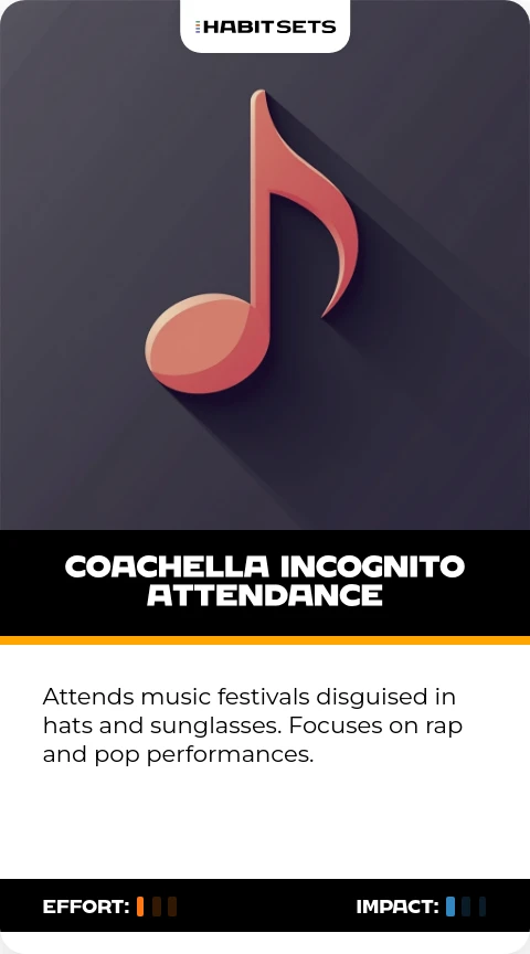 Attends music festivals disguised in hats and sunglasses. Focuses on rap and pop performances.