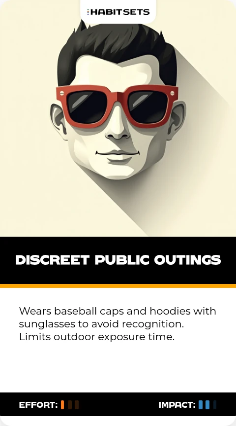 Wears baseball caps and hoodies with sunglasses to avoid recognition. Limits outdoor exposure time.
