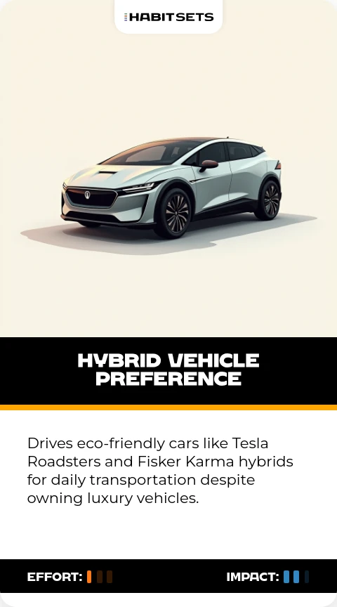 Drives eco-friendly cars like Tesla Roadsters and Fisker Karma hybrids for daily transportation despite owning luxury vehicles.