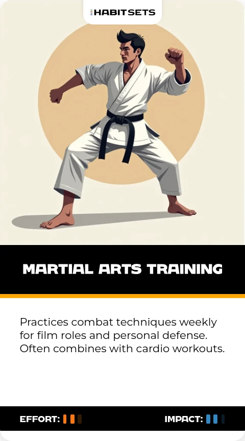 Practices combat techniques weekly for film roles and personal defense. Often combines with cardio workouts.
