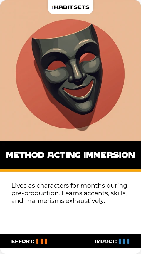 Lives as characters for months during pre-production. Learns accents, skills, and mannerisms exhaustively.