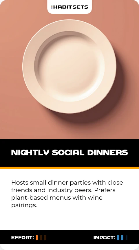 Hosts small dinner parties with close friends and industry peers. Prefers plant-based menus with wine pairings.