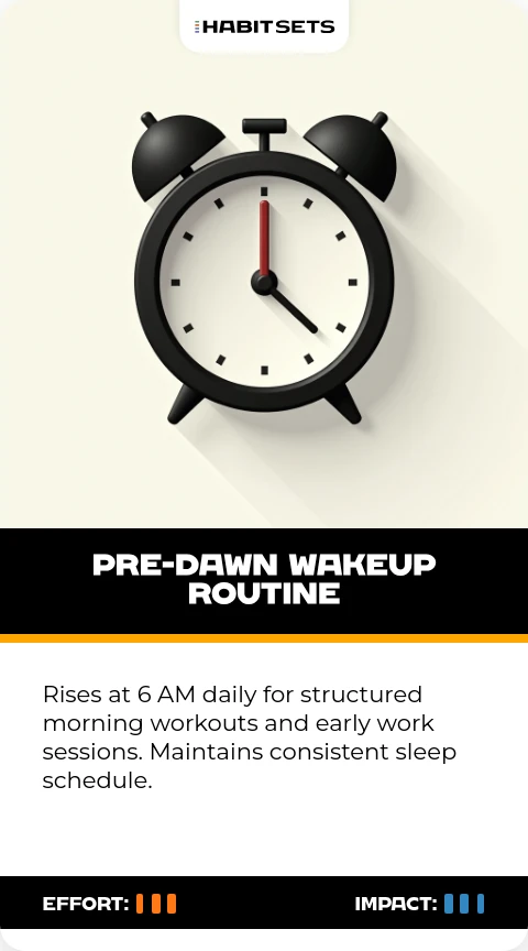 Rises at 6 AM daily for structured morning workouts and early work sessions. Maintains consistent sleep schedule.