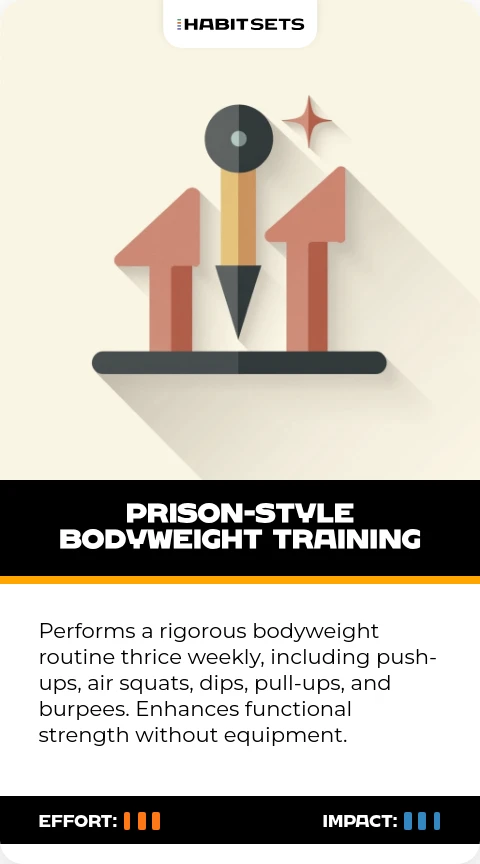 Performs a rigorous bodyweight routine thrice weekly, including push-ups, air squats, dips, pull-ups, and burpees. Enhances functional strength without equipment.