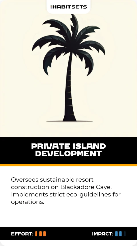 Oversees sustainable resort construction on Blackadore Caye. Implements strict eco-guidelines for operations.