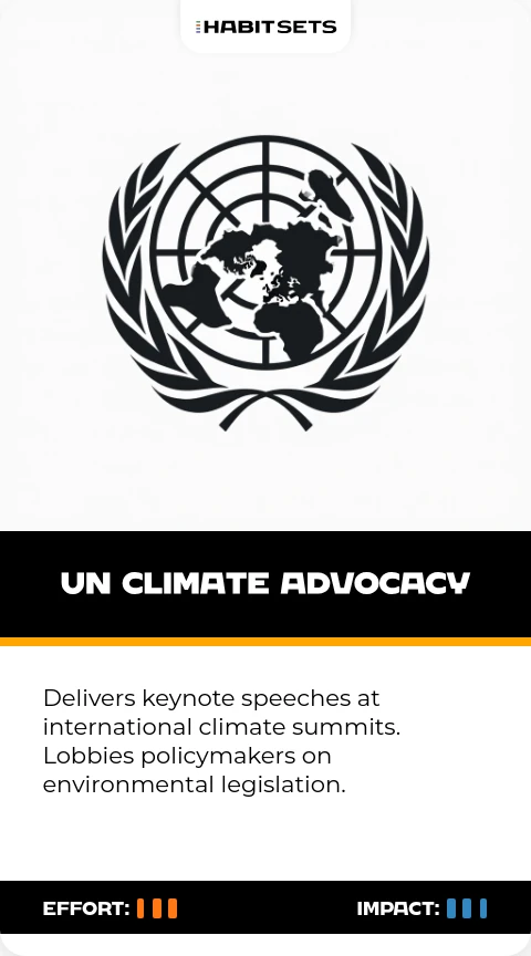 - Purposeful Action: From environmental investment to charitable auctions and UN advocacy, his habits are consistently directed towards causes he believes in. This demonstrates the impact of aligning actions with a clear purpose.