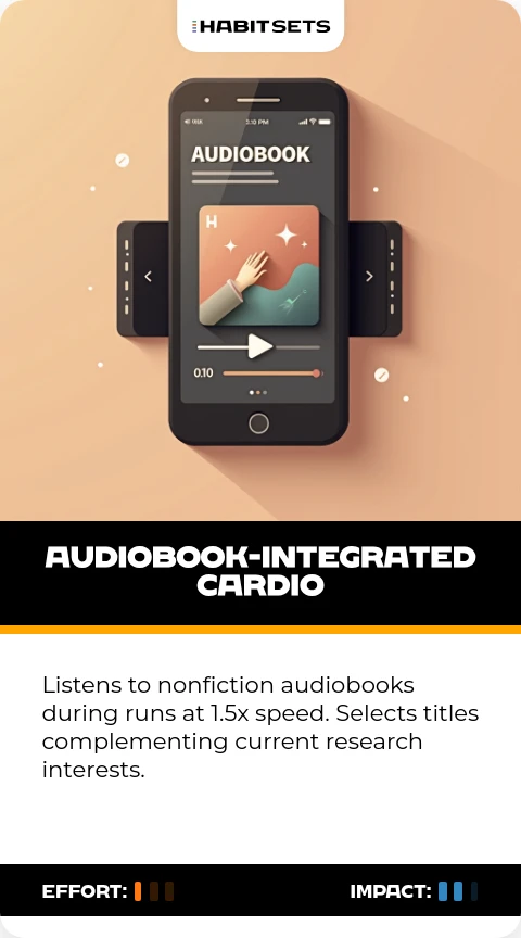 Listens to nonfiction audiobooks during runs at 1.5x speed. Selects titles complementing current research interests.