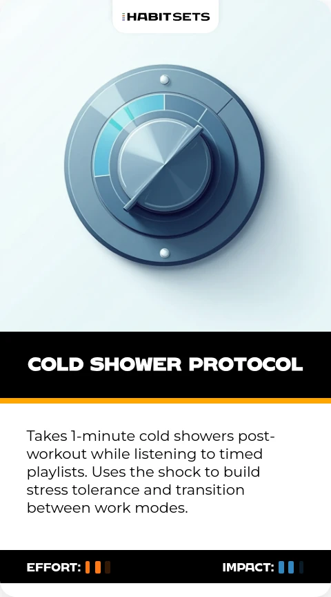 Takes 1-minute cold showers post-workout while listening to timed playlists. Uses the shock to build stress tolerance and transition between work modes.