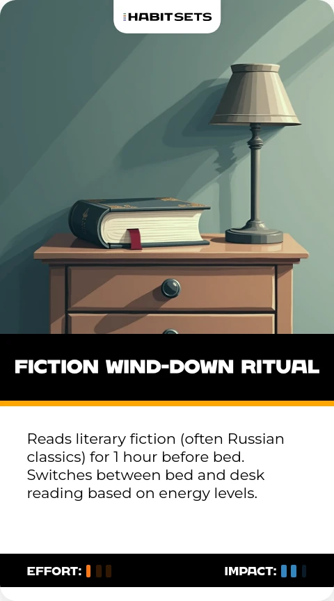 Reads literary fiction (often Russian classics) for 1 hour before bed. Switches between bed and desk reading based on energy levels.