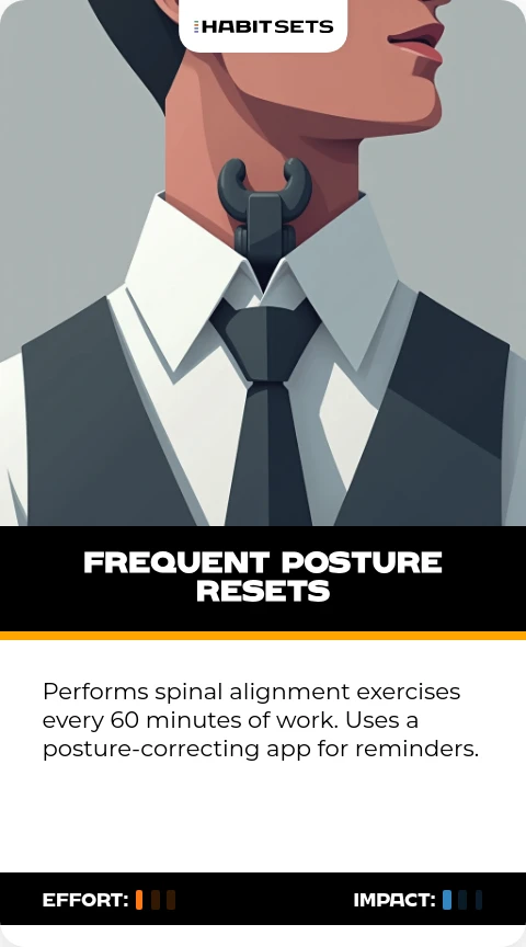Performs spinal alignment exercises every 60 minutes of work. Uses a posture-correcting app for reminders.