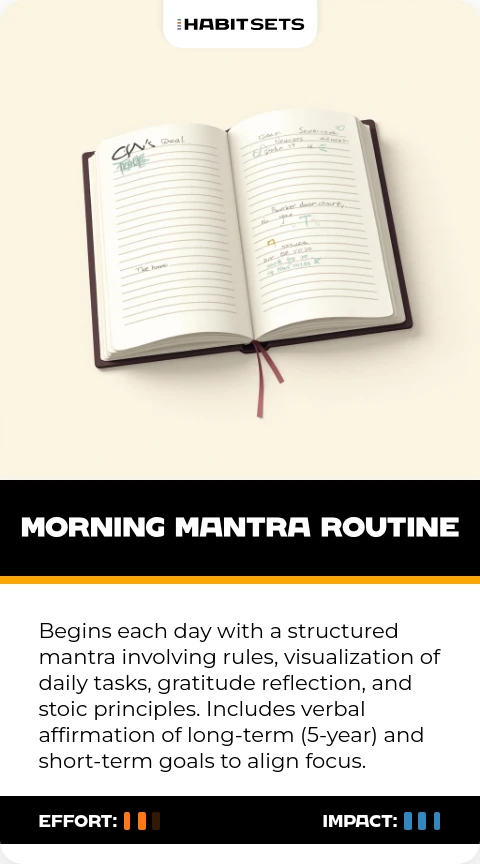 Begins each day with a structured mantra involving rules, visualization of daily tasks, gratitude reflection, and stoic principles. Includes verbal affirmation of long-term (5-year) and short-term goals to align focus.