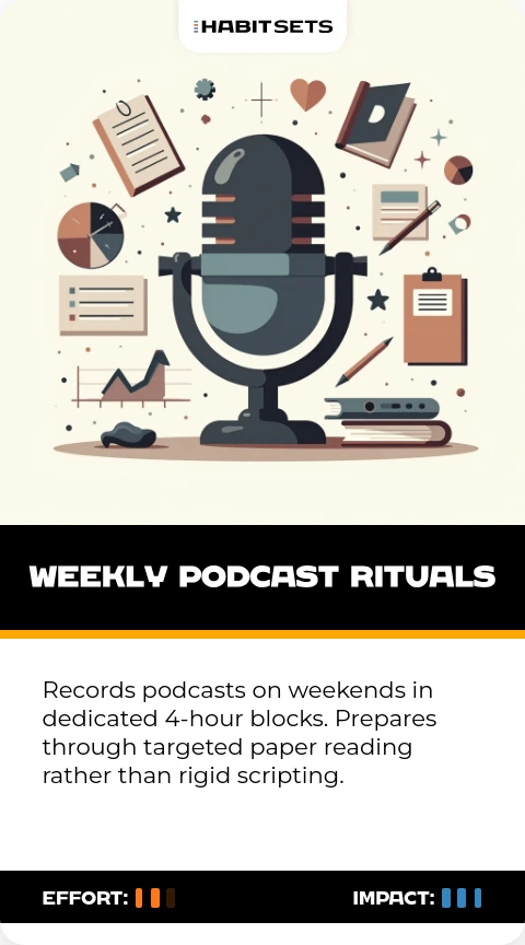 Records podcasts on weekends in dedicated 4-hour blocks. Prepares through targeted paper reading rather than rigid scripting.