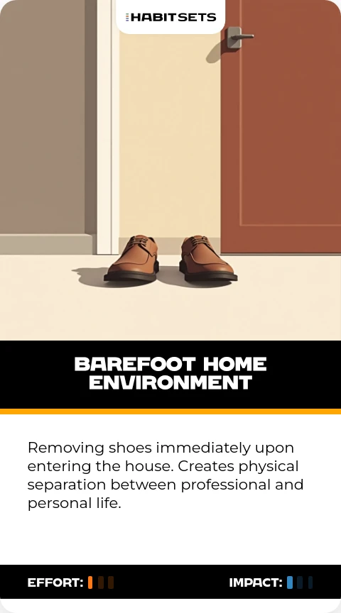 Removing shoes immediately upon entering the house. Creates physical separation between professional and personal life.