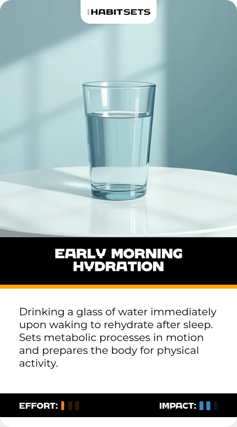 Drinking a glass of water immediately upon waking to rehydrate after sleep. Sets metabolic processes in motion and prepares the body for physical activity.