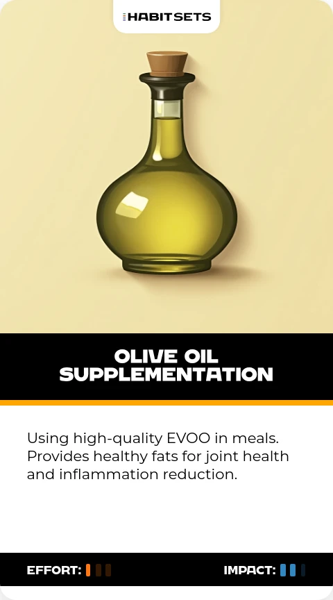 Using high-quality EVOO in meals. Provides healthy fats for joint health and inflammation reduction.