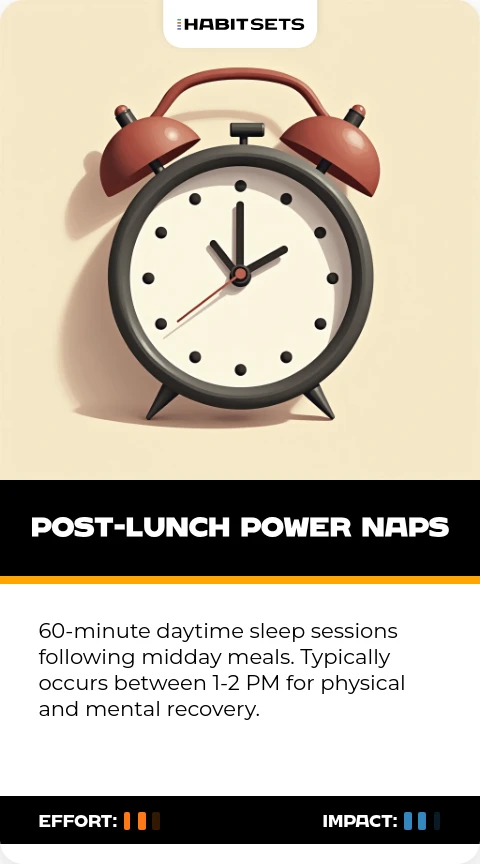60-minute daytime sleep sessions following midday meals. Typically occurs between 1-2 PM for physical and mental recovery.