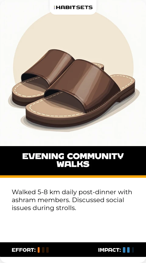 Walked 5-8 km daily post-dinner with ashram members. Discussed social issues during strolls.