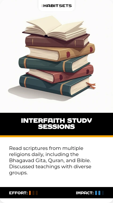 Read scriptures from multiple religions daily, including the Bhagavad Gita, Quran, and Bible. Discussed teachings with diverse groups.
