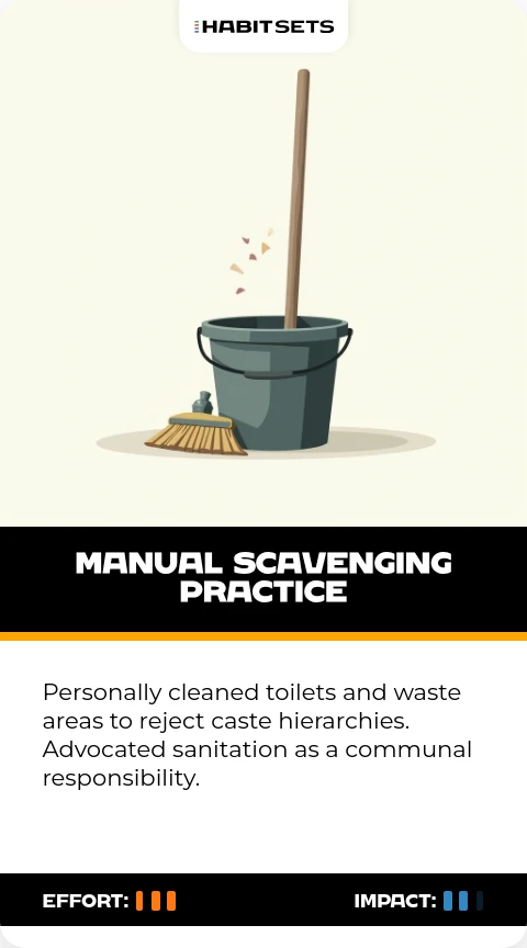 Personally cleaned toilets and waste areas to reject caste hierarchies. Advocated sanitation as a communal responsibility.