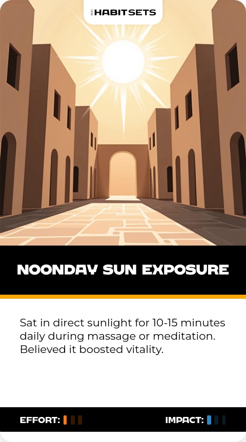 Sat in direct sunlight for 10-15 minutes daily during massage or meditation. Believed it boosted vitality.