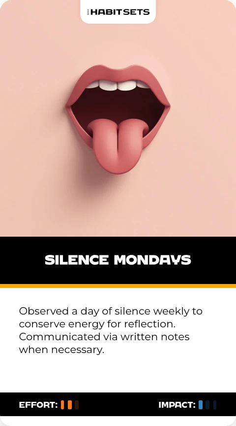 Observed a day of silence weekly to conserve energy for reflection. Communicated via written notes when necessary.