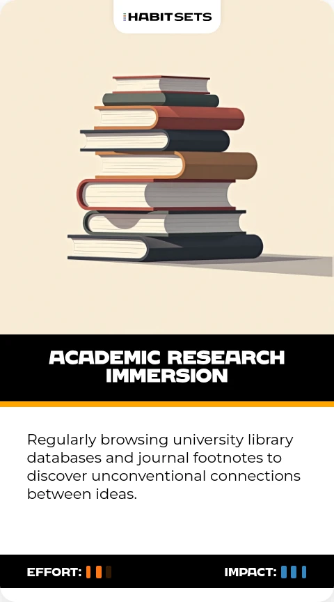 Regularly browsing university library databases and journal footnotes to discover unconventional connections between ideas.