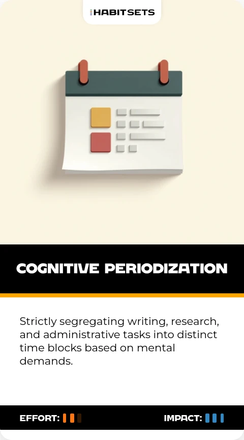 Strictly segregating writing, research, and administrative tasks into distinct time blocks based on mental demands.