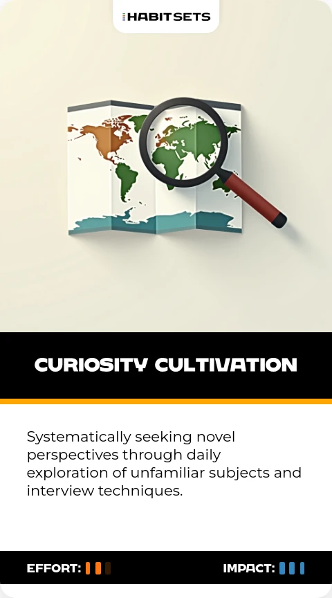 Systematically seeking novel perspectives through daily exploration of unfamiliar subjects and interview techniques.