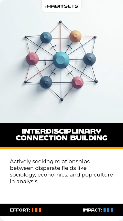 Actively seeking relationships between disparate fields like sociology, economics, and pop culture in analysis.