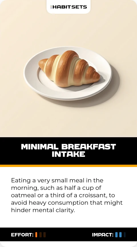 Eating a very small meal in the morning, such as half a cup of oatmeal or a third of a croissant, to avoid heavy consumption that might hinder mental clarity.