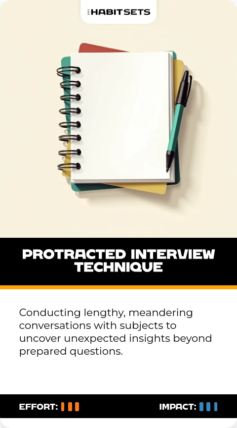 Conducting lengthy, meandering conversations with subjects to uncover unexpected insights beyond prepared questions.