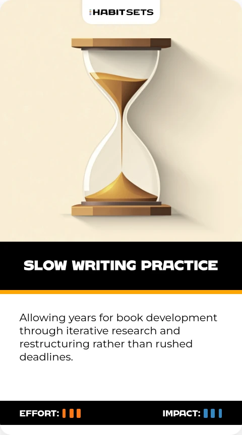 Allowing years for book development through iterative research and restructuring rather than rushed deadlines.